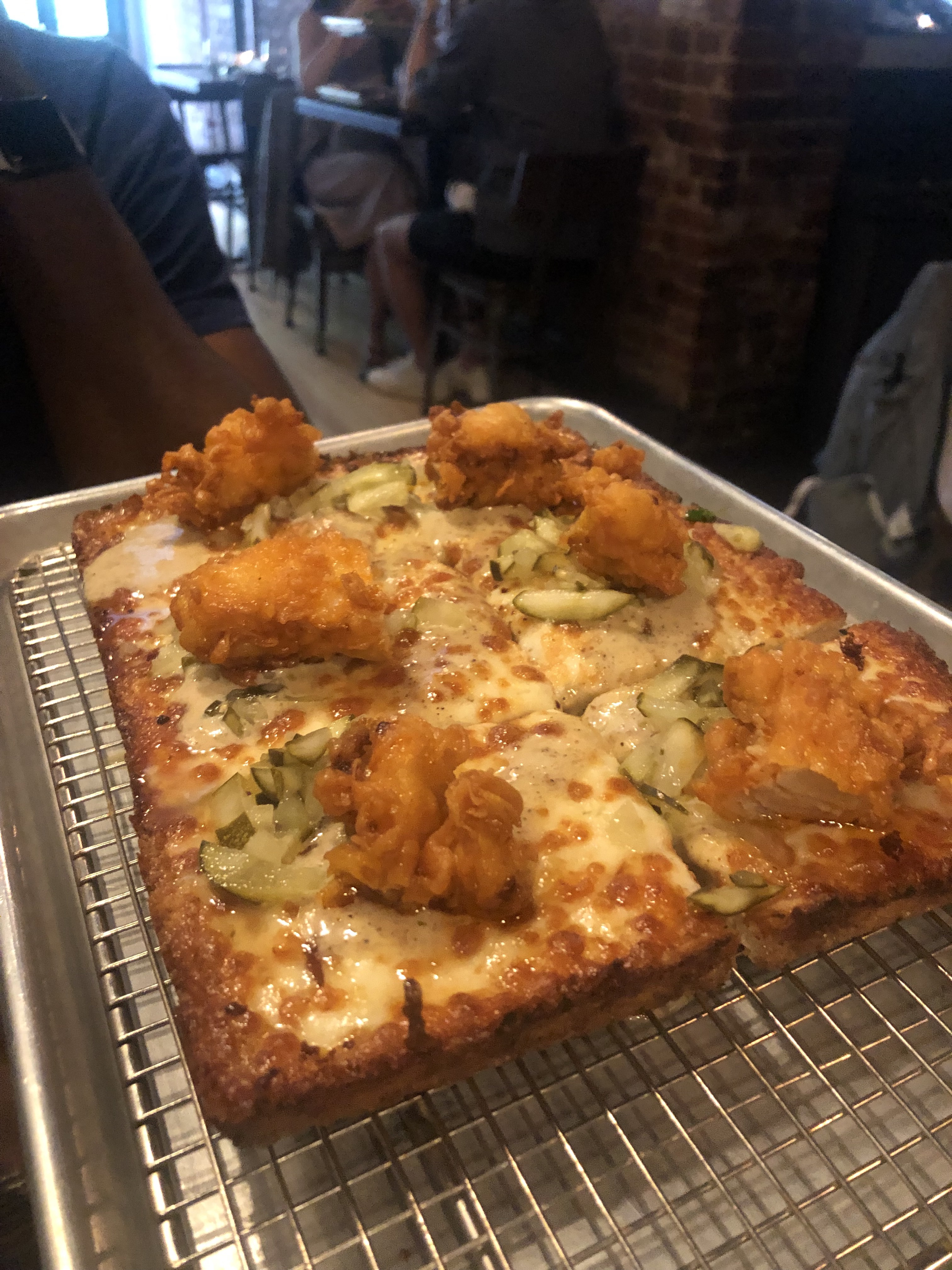 Let me tell you this pizza place is excellent. I’ve been here quite a few times. The pizza, as pictured, is the Hot Chicken served with Bama white sauce and chopped pickles. I know what you’re thinking, that’s nasty. Trust me when I say it’s really not. All the different flavors come together and with the crust it turned out really well. However, this particular pizza is only available at their sister location; Emmy Squared in the East Village. However, this particular blog is about my favorite location in the West Village names Emily Loves Pizza. This is their main location which kicked everything off. Do make a reservation in advance before going because this place can become quite full. I repeat don’t go without a reservation because I’ll be saying I told you. When you first walk in you are immediately met by the host which can help you get settled. The two main items that you want to get is the burger named the Emmy Burger Double Stack. It comes with Pat LaFrieda dry aged beef. I should stop there because if you’ve tried their particular cuts, you know it’s good, however I’ll continue. It then is topped with Emmy sauce, caramelized onions, American cheese, and pickles on a pretzel bun. That’s a lot right? You bet it is. Thankfully I had Leah to share it with me because it also came with curly fries. When you taste into this burger, just know it’s going to be amazing. Do try to make your reservation early at like 6 because they will sell out of this burger since they only make limited quantities each night. Yeah, it’s one of those special burgers that they don’t make too much of to keep it’s allure, I guess. However, it’s really good. When you bite into it, it’s juicy and the bun just goes so well with it. The next item on the menu you have to try is one of their pizzas. The one I had was the Colony. The Colony has pepperoni, pickled chili with honey. I know it’s also a weird combination but it taste really, really good. The service there is also really good which tops it off and they are very accommodating. You won’t be disappointed. As always I would be remised if I didn’t say please bring some money as this place can be pricey but it’s worth the cost.