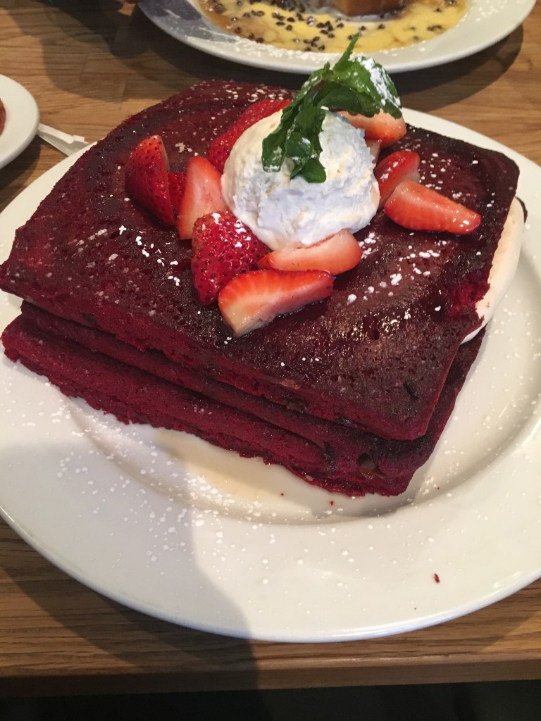 I know what you’re thinking. Those Red Velvet Pancakes look really, really good. You would be right because they look just as good as they taste. So first, I will say, that this place does have other options because pancakes as you can tell from their name. They cook different types of cakes from Eggs White, Omelets, Benedicts, and even Chicken and Waffles Benedict. However, on this occasion, I didn’t try to the eggs, I wanted the Red Velvet Pancakes. I will add that Leah tried the Kitchen Sink. I know, not the literal kitchen sink but their menu item called the Kitchen Sink that had three eggs scrambled with sausage crumbles, gruyere cheese, potatoes, peppers, onions, topped with sausage gravy and a jumbo biscuit. The next time, I come, I’ll have to try the Cookie Dough Stuffed French Toast. However, lets get back to the pancakes. The pancakes are with chocolate chips, which you can see if you look closely to the picture. Now who puts chocolate chips into red velvet pancakes instead of buttermilk pancakes, they do. In addition to the chocolate chips, they layer it with mascarpone, top it with maple syrup, Chantilly cream, and fresh strawberries. Don’t ask me what is Chantilly cream because I don’t even know. All I know is that this thing right here is on pointtttt. Once you cut the pancakes and then add the maple syrup on top of it, it almost makes you want to slap someone lol. Not figuratively, please don’t do that. The different flavors blend together very nicely and it’s not too sweet but just right. The pancakes by itself will be enough for one person but do share. This place only accepts cash so if you forget to bring cash, they do have an atm machine inside which I would suggest using because of course there is a surcharge fee for taking money out and from your bank as well. This place also does get crowded so do prepare before arriving.