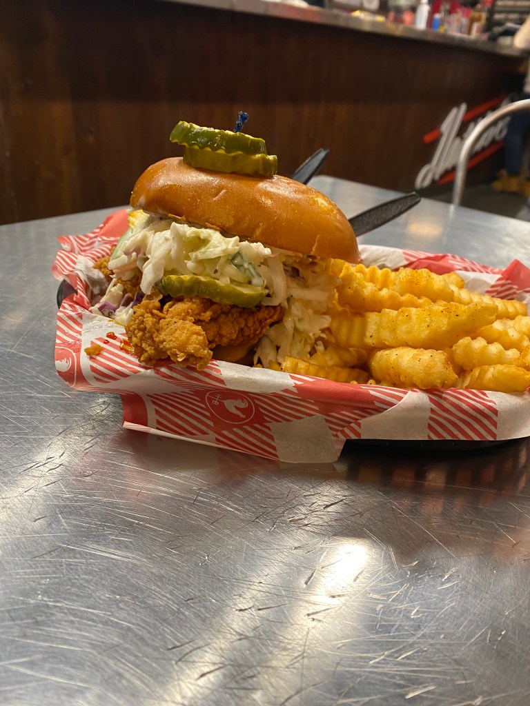 Let me tell you that besides Shack Shake’s chicken sandwich, this might be the best chicken sandwich I’ve had to date. When you look at this chicken sandwich, it’s a fried chicken sandwich in a fresh bun, cole slaw, nashville comeback sauce and a kosher pickle on top and inside. You can choose how how you want it but I decided to go with mild because me and hot food don’t go well together. The chicken sandwich is served with one side, so I choose the fries. I do want to warn you that you will wait in line and I waited about 40 minutes but it went really quick by talking to other people in line. Lol. That’s what happens you know, you start talking to other people about if it’s worth it. When I was finally at the order counter, you order your food and they will bring it to you. When I finally took my first bite, the chicken sandwich was well seasoned, crispy but also tender. It was cooked just right and the chicken breast was quite big. It’s kind of difficult to cook a big chicken breast just right and they were able to do it, so I’ve got to 👏🏾 them for real. I’m still questioning how I ate the whole sandwich right now as I could barely eat the fries. The cole slaw was also great on top because it added a great balance and usually I’m not the best fan of cole slaw but this was just right and not tangy or overpowering. You have to hold this chicken sandwich with two hands and just get in there. The cole slaw will fall out and it may take you a while to get it in your mouth because of how big this sandwich is but when you finally do, it will be like nothing you’ve tried before. Don’t try cutting this sandwich because it’s going to be an even bigger mess. Additionally, they have fried chicken which I tried and Leah wanted hers medium. Let me tell you, I was sweating a little and wondered if they turned on the heat because I was hot. If you’re able to eat this and want dessert, they have a cupcake place right next to it which I’ll discuss at other time. Look if you’re in Nashville and don’t go to this place, what we’re you thinking about 🤦🏾♂️. You’ll enjoy it for sure and it seems that this place is consistently good which is difficult to find places like that. Buena suerte. You got this.