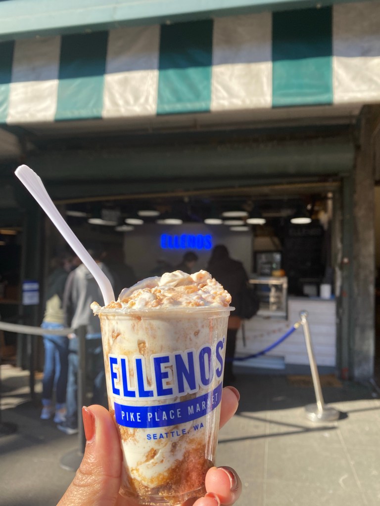 When you come to Pike Place, there are so many things to taste, smell, and see. However, there’s one place that you must stop by and it’s Ellenos. I can assure you that you haven’t tried yogurt in the way they make it and you will not see it anywhere else. Yes, the prices can be high but it’s worth it. The picture above is the Apple Pie Crisp. Just look at it. Tell me this isn’t something you would want to try. You see a little bit of cinnamon swirls surrounded by some pieces of apples mixed with almost graham cracker bits. I will say when you taste it, it is very delightful and it almost surprises you. Like wow that was really good. The best part about this place is that you can ask for a sample or a recommendation so that you can try the flavor that fits you. The Apple Pie Crisp tasted like a home style apple pie but with graham cracker crust mixed with yogurt. The yogurt isn’t your typical yogurt as it has a rich flavor but it’s not plain as the flavors mix in very well with it. This can be almost like a dessert and trust me, don’t leave without stopping by, you can’t miss it.