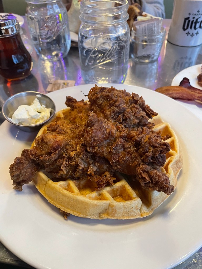 Russel Wilson to the Broncos? One of the reasons why I visited Seattle was to see him play I guess that dream sailed. 🤷🏾‍♂️ I can say though that Denver is next on the list though so we’ll see. Above is the fried chicken and waffle. I know what you’re thinking, there are so many chicken and waffle choices and you would be right (even my favorite has been Sweet Chick) but this is slightly different. You can tell by looking at it that they use a boneless chicken thigh which you normally don’t find many times so I have to give them a nod for trying something new. Now to the waffle, the interesting part here about the waffle is that they use a cornmeal which is like a cornbread taste and I have to say it was on point. I liked the taste of it and it combined very well with the fried chicken. The seasoning on the chicken was really good as in it was seasoned well and guess what, maple syrup was standard. Now that’s what I’m talking about. Anyway, the size of this was also pretty good as I couldn’t even eat the entire thing because of how big it was. If you’re in Capitol Hill this place is a must try. The service was also good as well. Sit by the window and if you go early, you can catch a good picture.