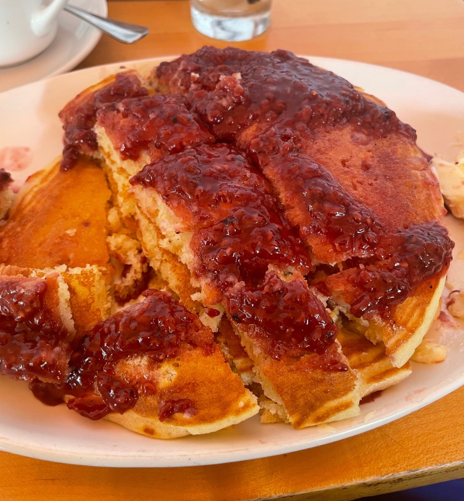 This is probably one of the most honest photos I’ve taken. This was the moment when you start eating and you’re like wait, I forgot to take a picture of my food. This usually doesn’t happen but it happened that day when you’re really hungry that you forget. Above is the stack of raspberry flat cakes. I can say that this was good but it did need maple syrup and butter which was most certainly missing from this. The raspberry was sweet, tangy and tart, but it had a good balance. I wouldn’t say it was fresh raspberries but it was good. The pancakes were fluffy, a decent size and not too heavy. In terms of seating, limited seating is available inside while they have tons of tables outside. The service could’ve been better since we waited a bit for someone to introduce themselves and take our order while waiting on our food to arrive. Overall, if you need a breakfast/brunch place, this is the place to go. Prices can be a little pricey so do prepare.